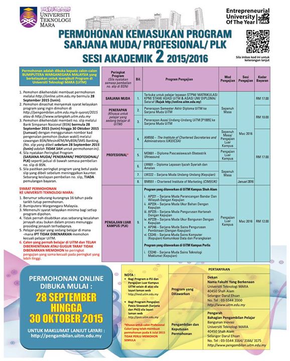 Uitm Perlis Permohonan Kemasukan Pelajar Ke Uitm Bagi Sesi Akademik 2 2015 2016 Sarjana Muda Penerapan Profesional Plk