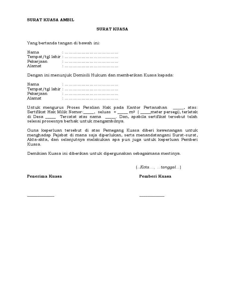 Perwakilan Pengambilan Sertifikat Perwakilan Contoh Surat Kuasa