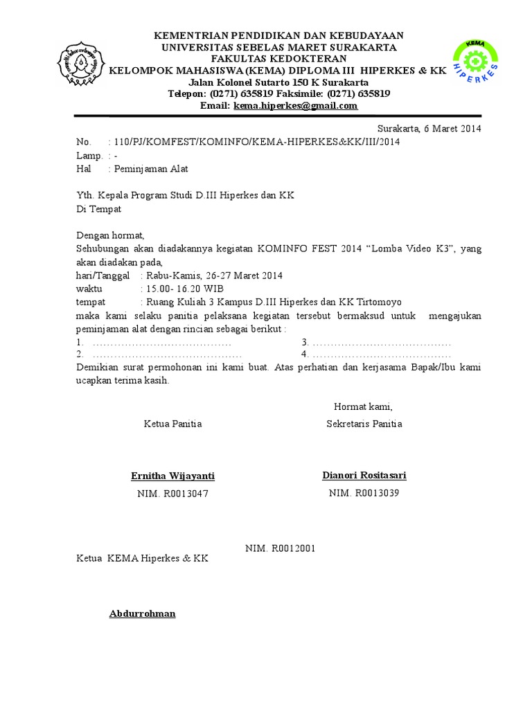 Contoh Surat Peminjaman Sarana Perlengkapan Seminan Himpunan Mahasiswa Media Belajar