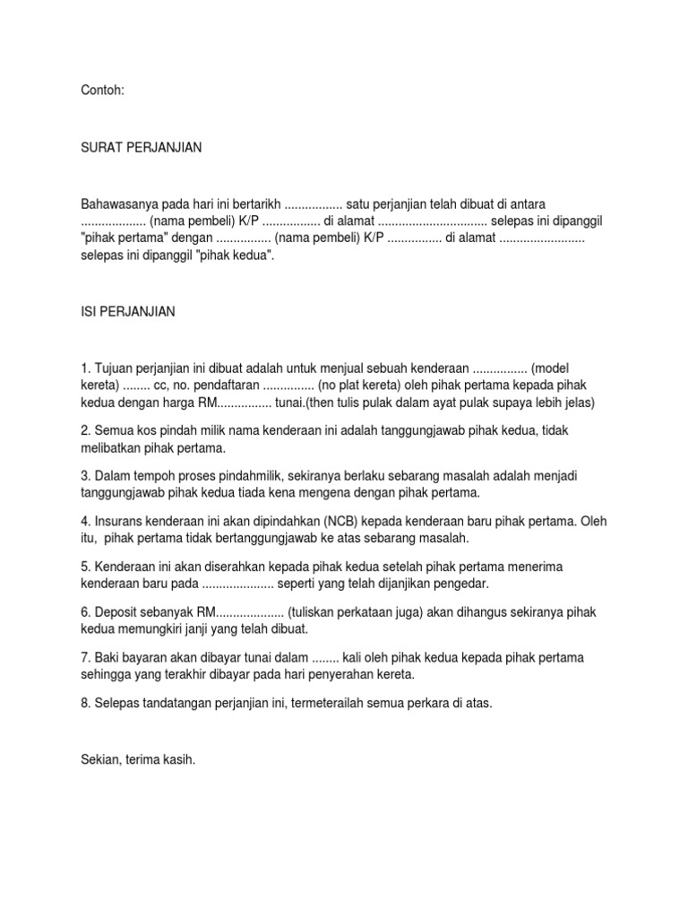 Contoh Surat Perjanjian Jual Beli Kenderaan