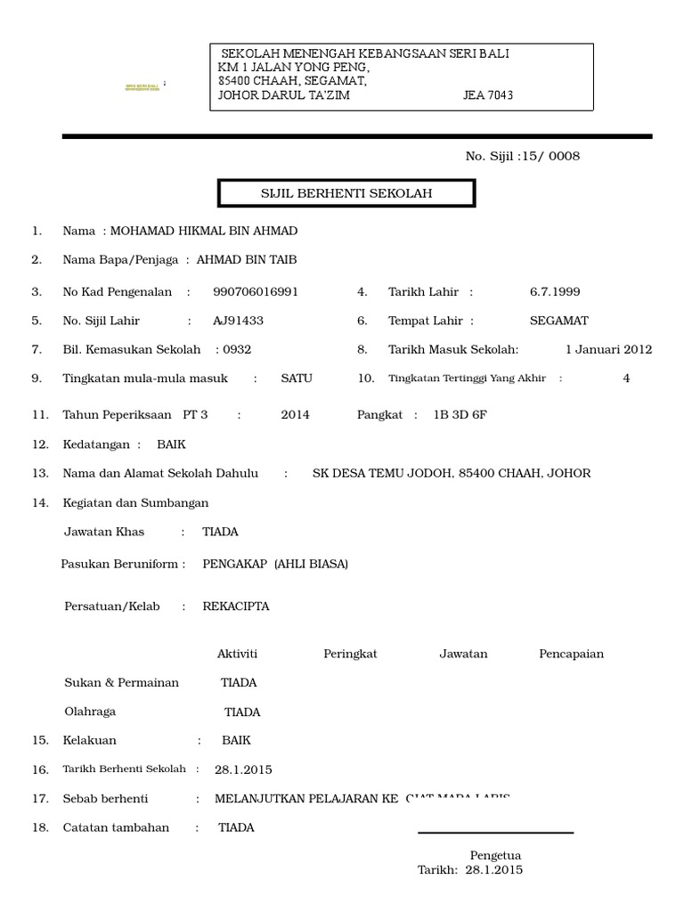 Contoh Sijil Berhenti Sekolah