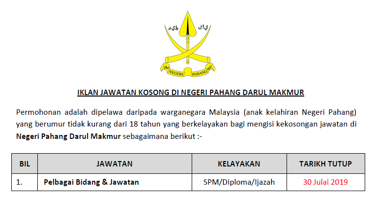 Jawatan Kosong Di Negeri Pahang Darul Makmur Kelayakan Spm Diploma Ijazah Ejawatankini Com
