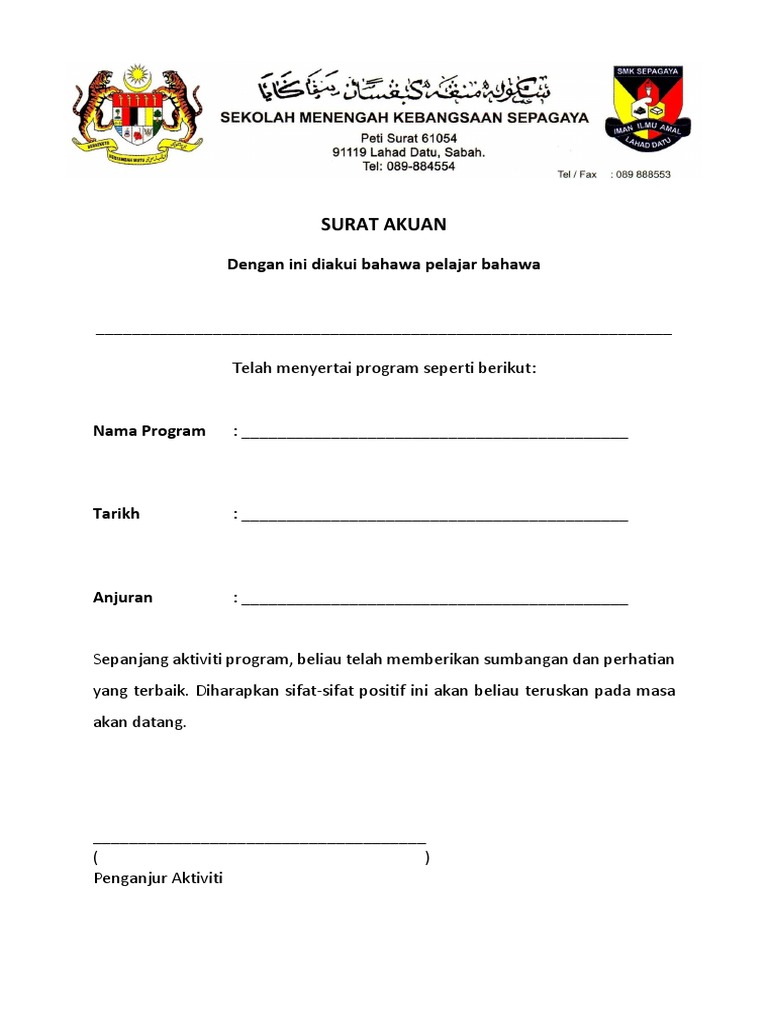 Surat Akuan Kebenaran Waris Mengikuti Aktiviti Koku