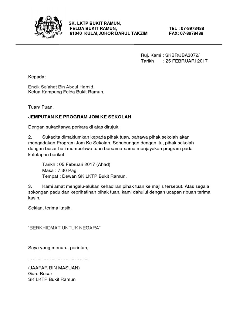 Contoh Surat Jemputan Ibu Bapa Ke Program Sekolah