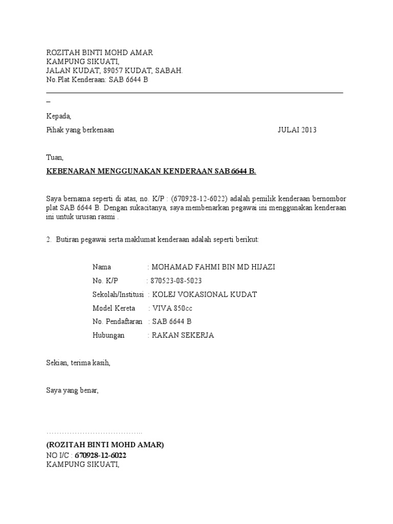 Contoh Surat Kebenaran Penggunaan Kenderaan Doc