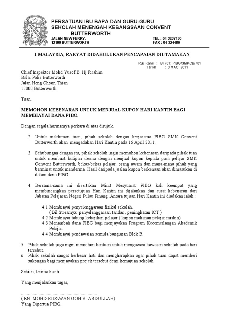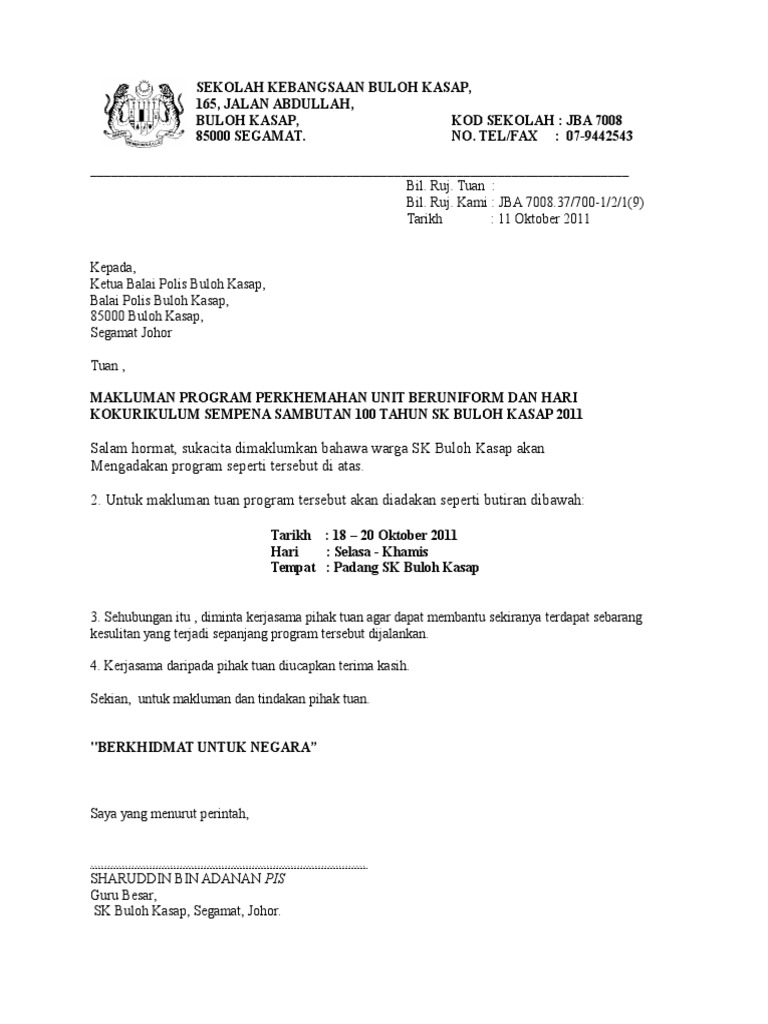 Contoh Surat Rasmi Memohon Kebenaran Mengadakan Program Di Sekolah