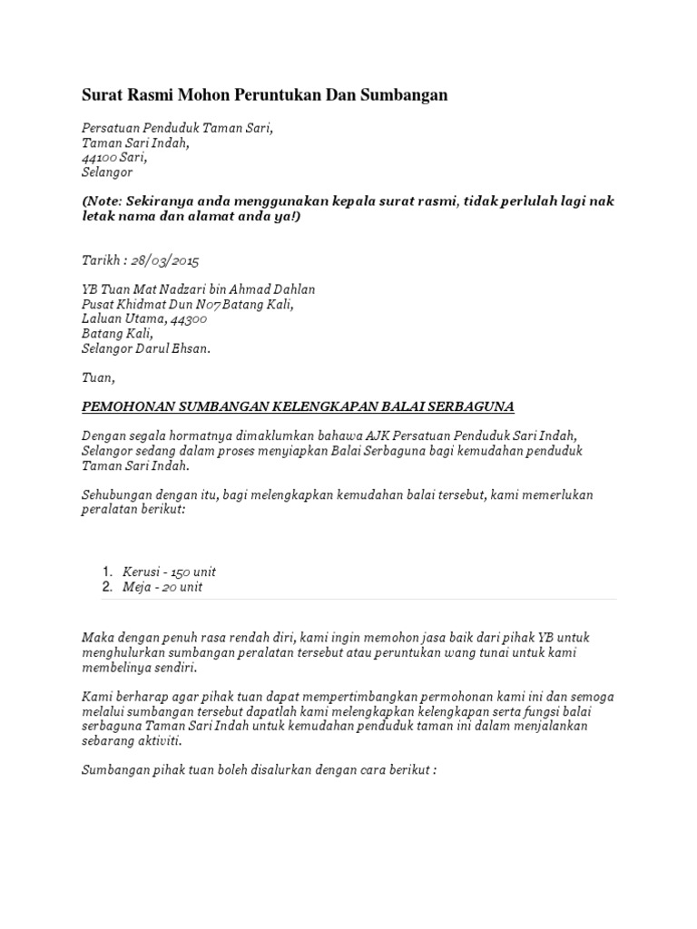 Surat Rasmi Mohon Peruntukan Dan Sumbangan