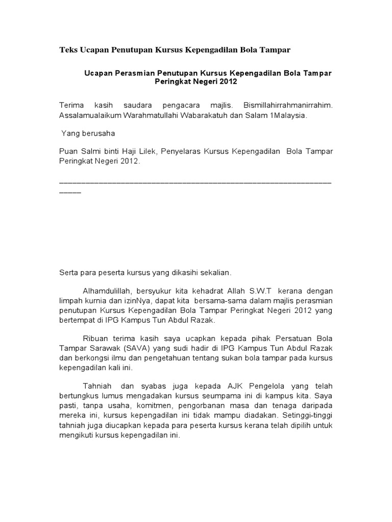 Teks Ucapan Penutupan Kursus Kepengadilan Bola Tampar