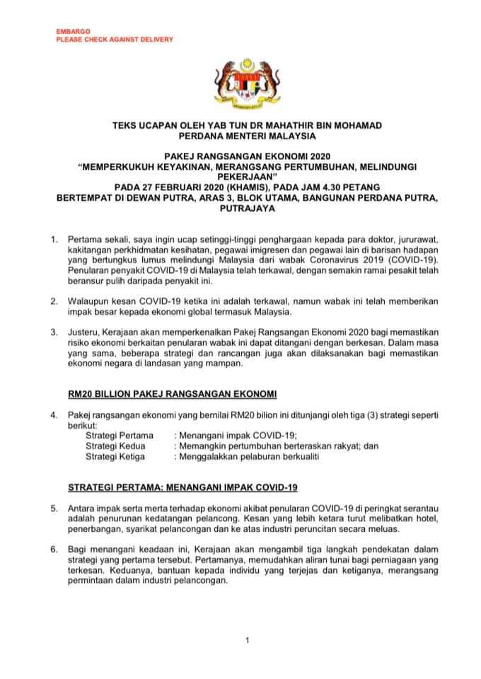 Teks Ucapan Pm Yab Tun Dr Mahathir Bin Mohamad Mengenai Pakej Rangsangan Ekonomi 2020 Layanlah Berita Terkini Tips Berguna Maklumat